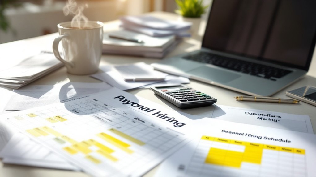 To handle seasonal employee payroll correctly, I’ll need to first properly classify workers as employees or contractors according to IRS guidelines, then set up appropriate tax withholdings including federal, state, and local taxes. I’ll implement an automated payroll system to track hours, process direct deposits, and manage overtime calculations. I’ll maintain thorough records of I-9s, W-4s, and time sheets while ensuring compliance with labor laws and benefits requirements. Understanding these key components is just the beginning of mastering seasonal payroll management.